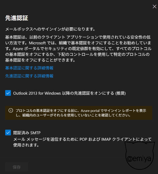※ 基本認証が無効でも、SMTP AUTHは使用可能です。 - OAuth を使用して IMAP、POP、SMTP 接続を認証する