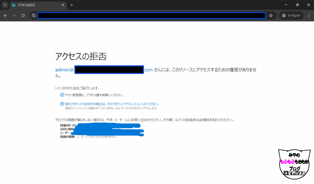 このようなメッセージは、SharePoint サイトや Teams に招待された外部ユーザーがアクセス時に表示されることがあります。