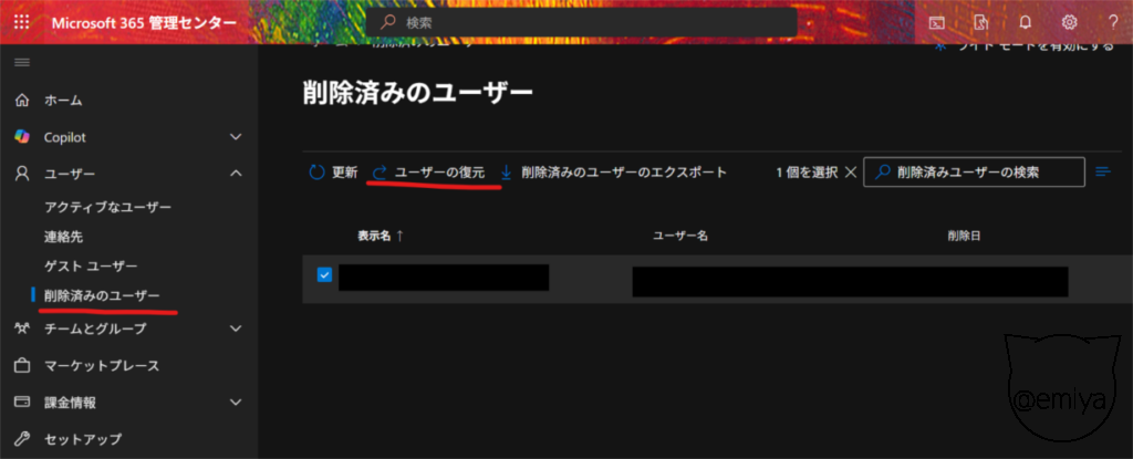 Microsoft 365 管理センターで、削除から30日以内であればアカウントを復元可能です。