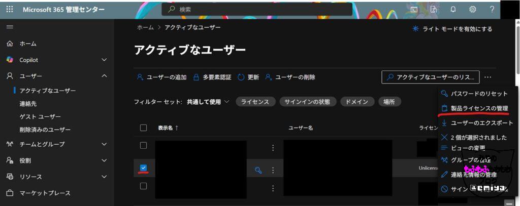 - 対象ユーザーをクリックし、「ライセンスとアプリ」を選択