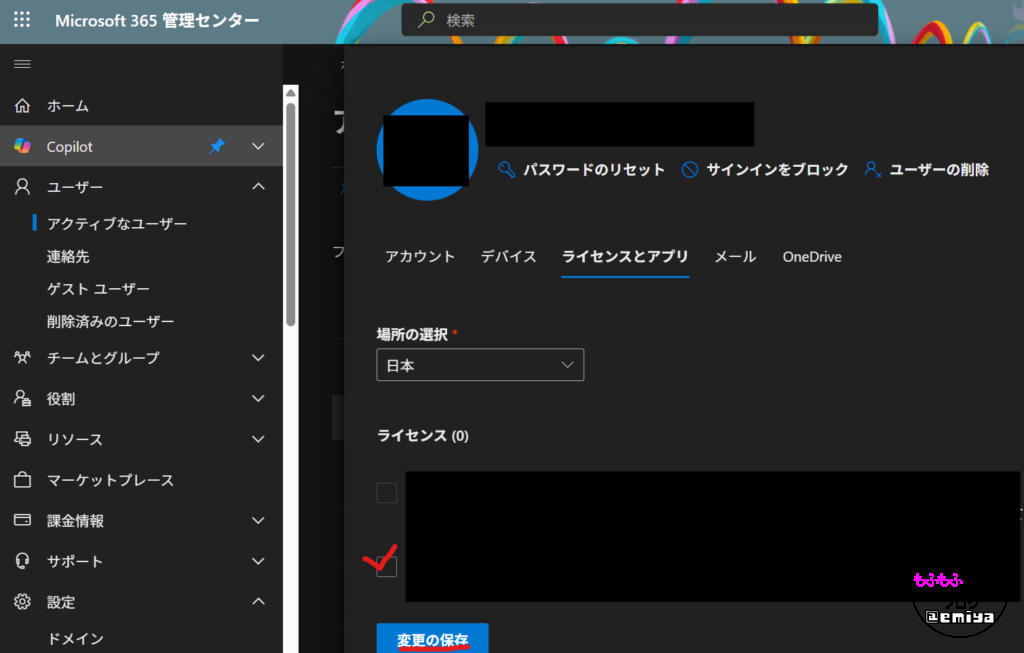 - 対象ユーザーをクリックし、「ライセンスとアプリ」を選択