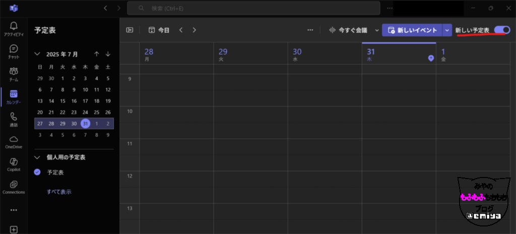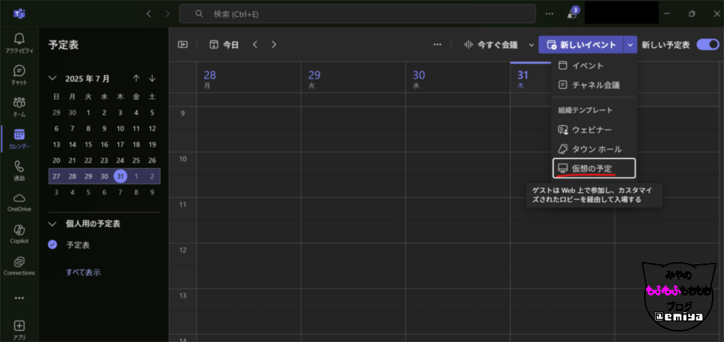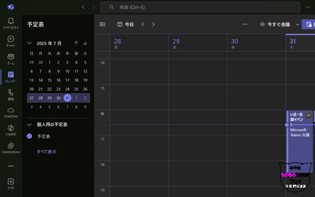 イマ―シブイベントですが、まずは、Teamsのカレンダーから予約する必要があります。