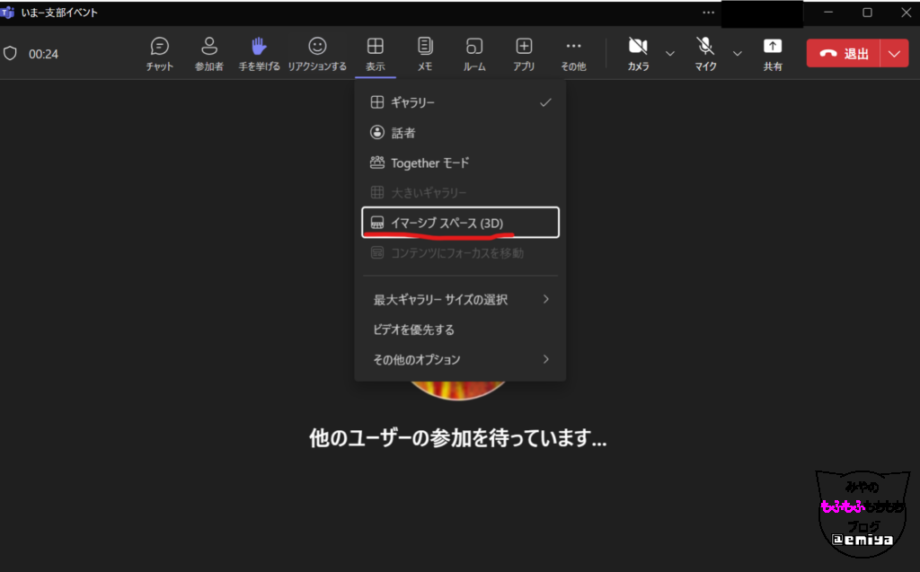 会議に参加出来たら、「表示」>「イマ―シブ スペース(3D)」を選択してください。
