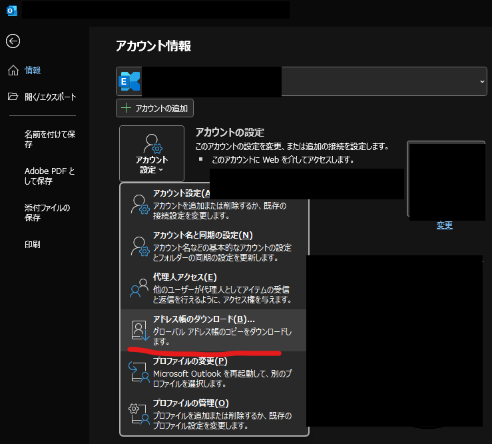 - [ファイル] → [アカウント設定] → [アドレス帳のダウンロード]