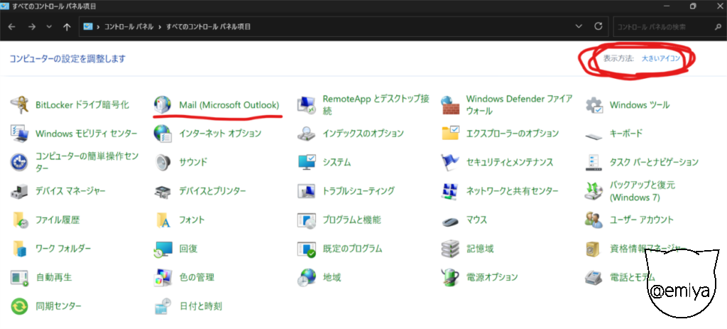 - [コントロールパネル] → [メール] → [プロファイルの表示]